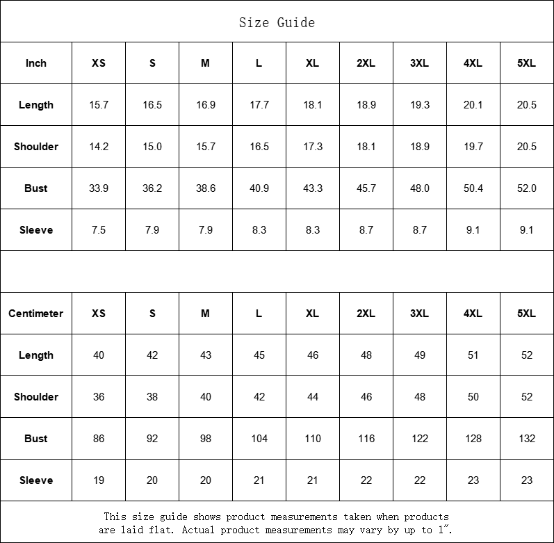 | Centimeter | XS | S | M | L | XL | 2XL | 3XL | 4XL | 5XL |